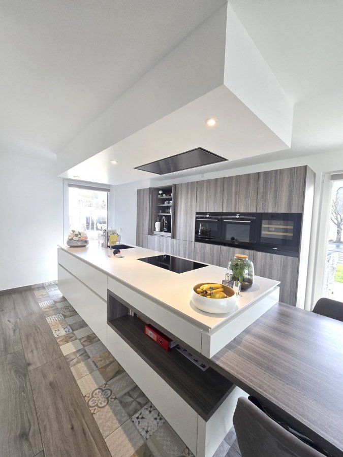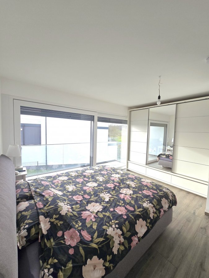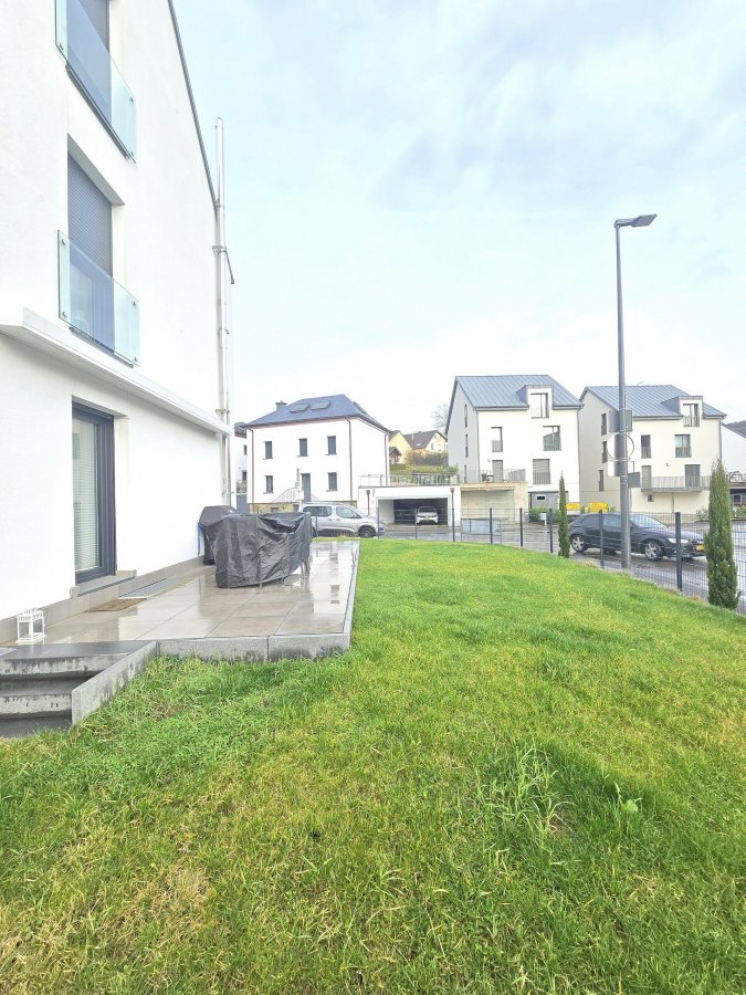 - rez-de-chaussée :hall d'entrée, cuisine bien équipée ouverte, living et salle à manger avec des grandes baie vitrées donnant vers grand jardin privatif clôturé et balcon aussi, une chambre ou bureau et WC séparée,