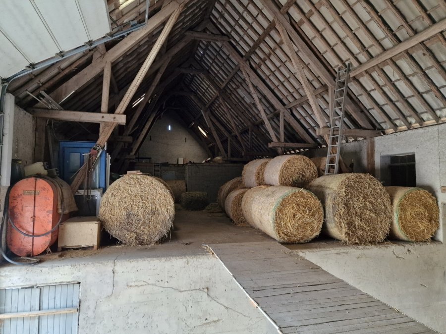 - rez-de-chaussée : entrée (2.45 m²), séjour (44.45 m²), cuisine (7.06 m²). - 1er étage : hall (10.14 m²), chambre 1 (25.44 m²), chambre 2 (14.01 m²), salle de bains (13.33 m²). Granges (400.88 m²), 4 garages pour 5 voitures (118,82 m²), atelier (65.76 m²), 6 box pour chevaux (118.98 m²).