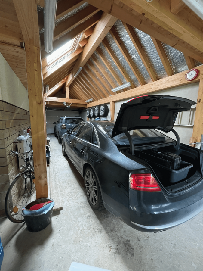il comprend un grand garage pouvant accueillir deux voitures, un second garage attenant à la maison pour deux à trois véhicules avec WC, ainsi qu'un troisième garage à l'arrière, idéal pour les motos ou comme espace de rangement.