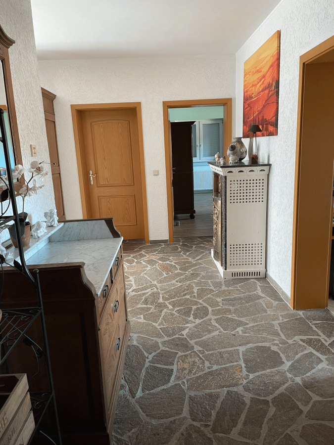 On y trouve également une pièce de passage menant directement à la terrasse, où se situe le système de chauffage, ainsi que trois pièces supplémentaires offrant un potentiel d'aménagement en espace de vie.